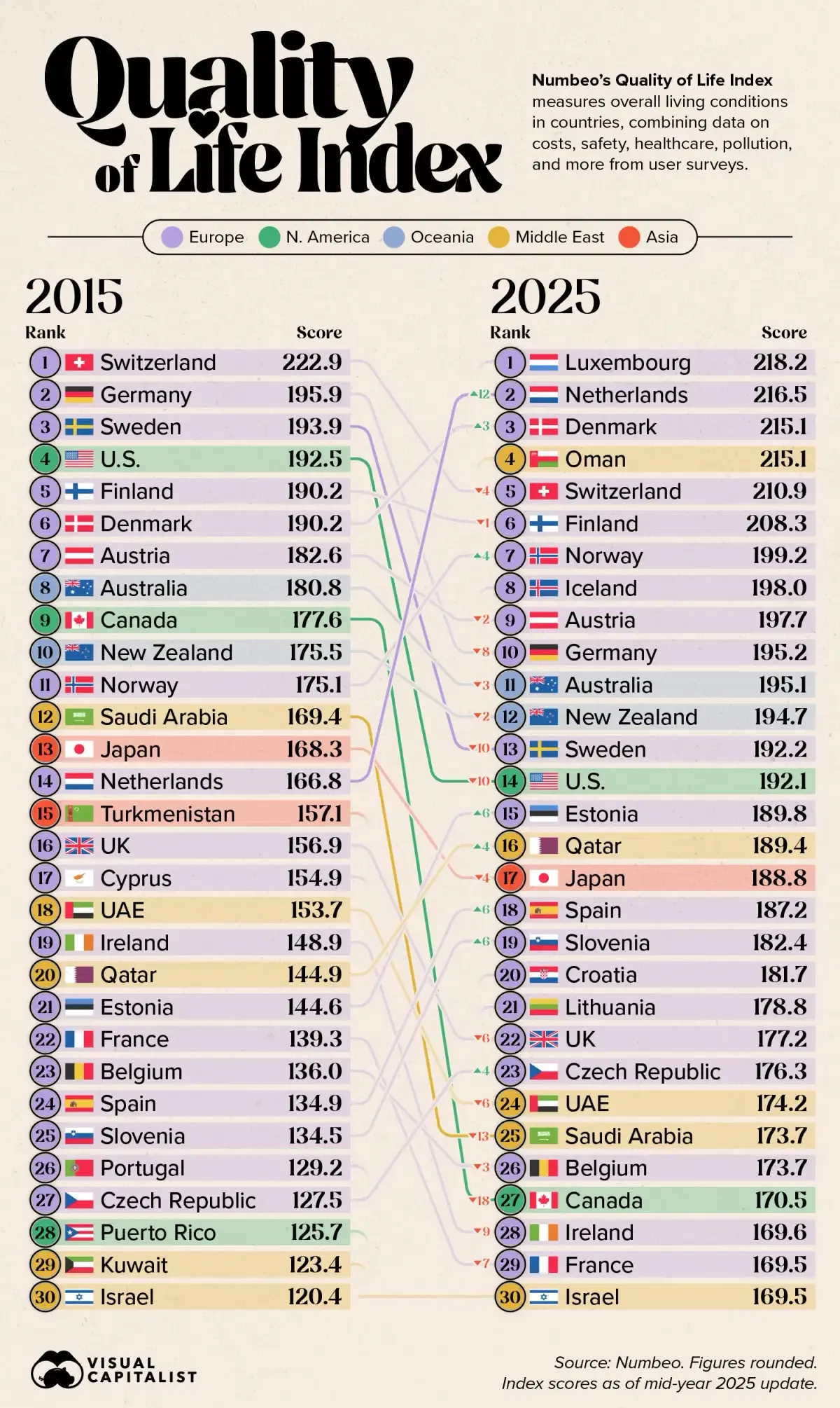 Using Numbeo’s Quality of Life Index, the chart combines data on costs, safety, healthcare, pollution, and more. While countries like Switzerland continue to rank among the world’s highest, others such as the Netherlands and Norway have climbed steadily.