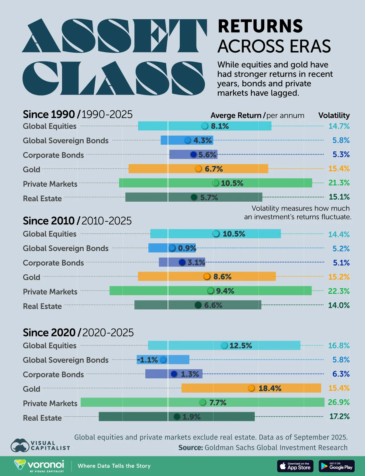 This graphic breaks down annualized returns and volatility across major asset classes over three distinct periods: long-term (1990–2025), mid-term (2010–2025), and the most recent cycle (2020–2025), using data from Goldman Sachs. Global equities and private markets exclude real estate, and data is as of September 2025.