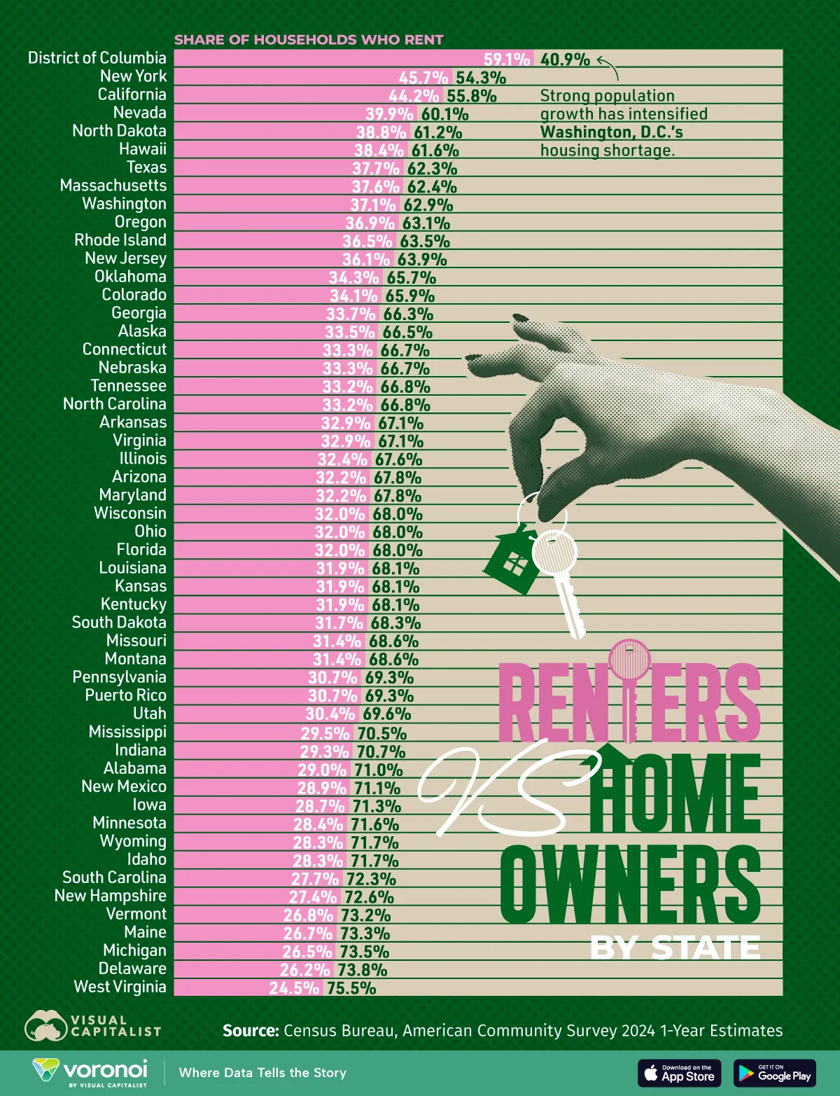 This graphic shows the share of Americans renting versus owning by state, based on data from the U.S. Census Bureau.