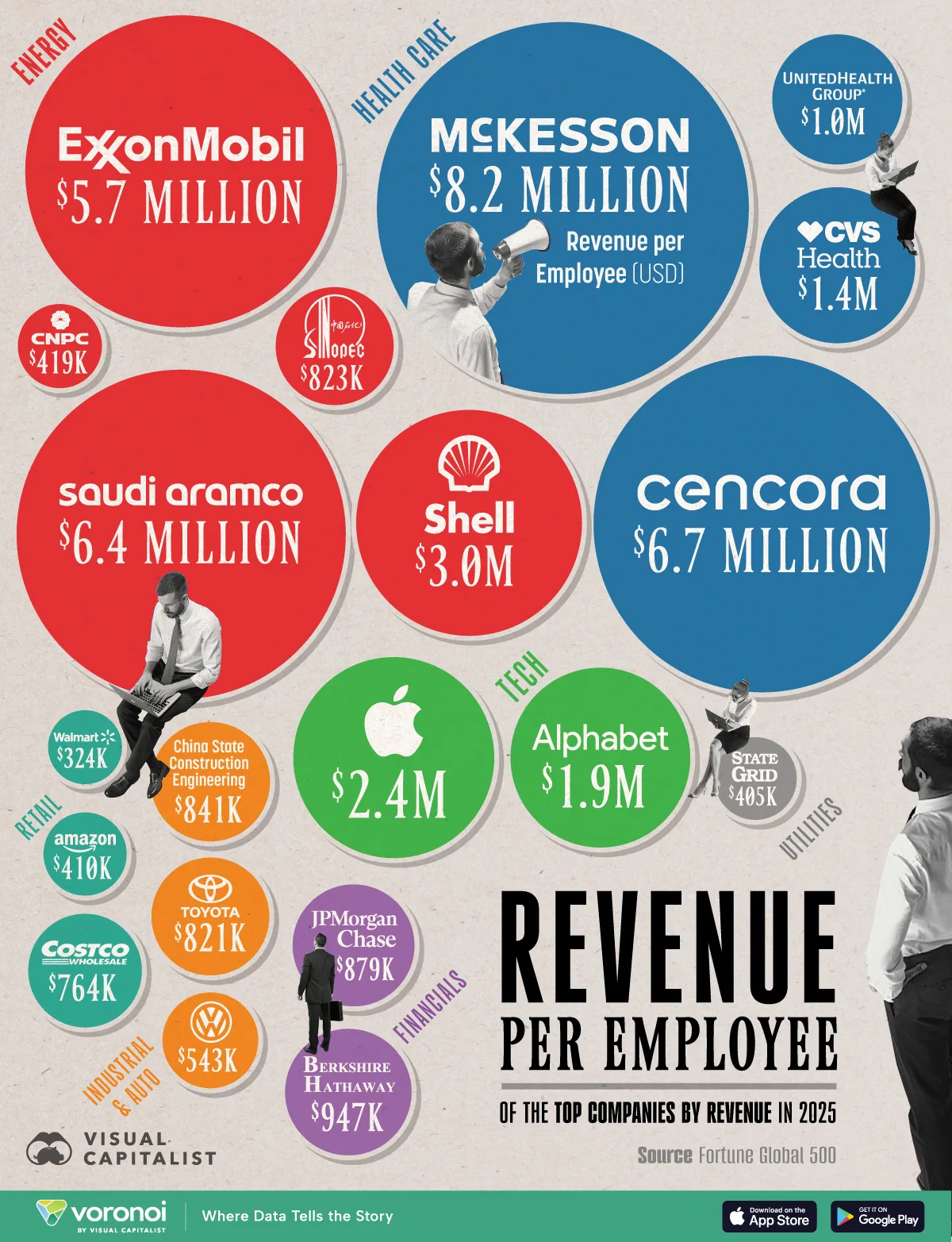 This infographic uses data from the Fortune Global 500 to highlight the revenue per employee of the world’s largest companies by revenue for fiscal years ending on or before March 31, 2025.