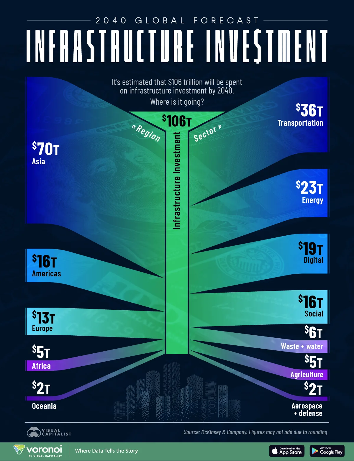 This infographic breaks down the estimated $106 trillion in infrastructure investment expected between now and 2040, both by sector and by region, based on data from McKinsey & Company.