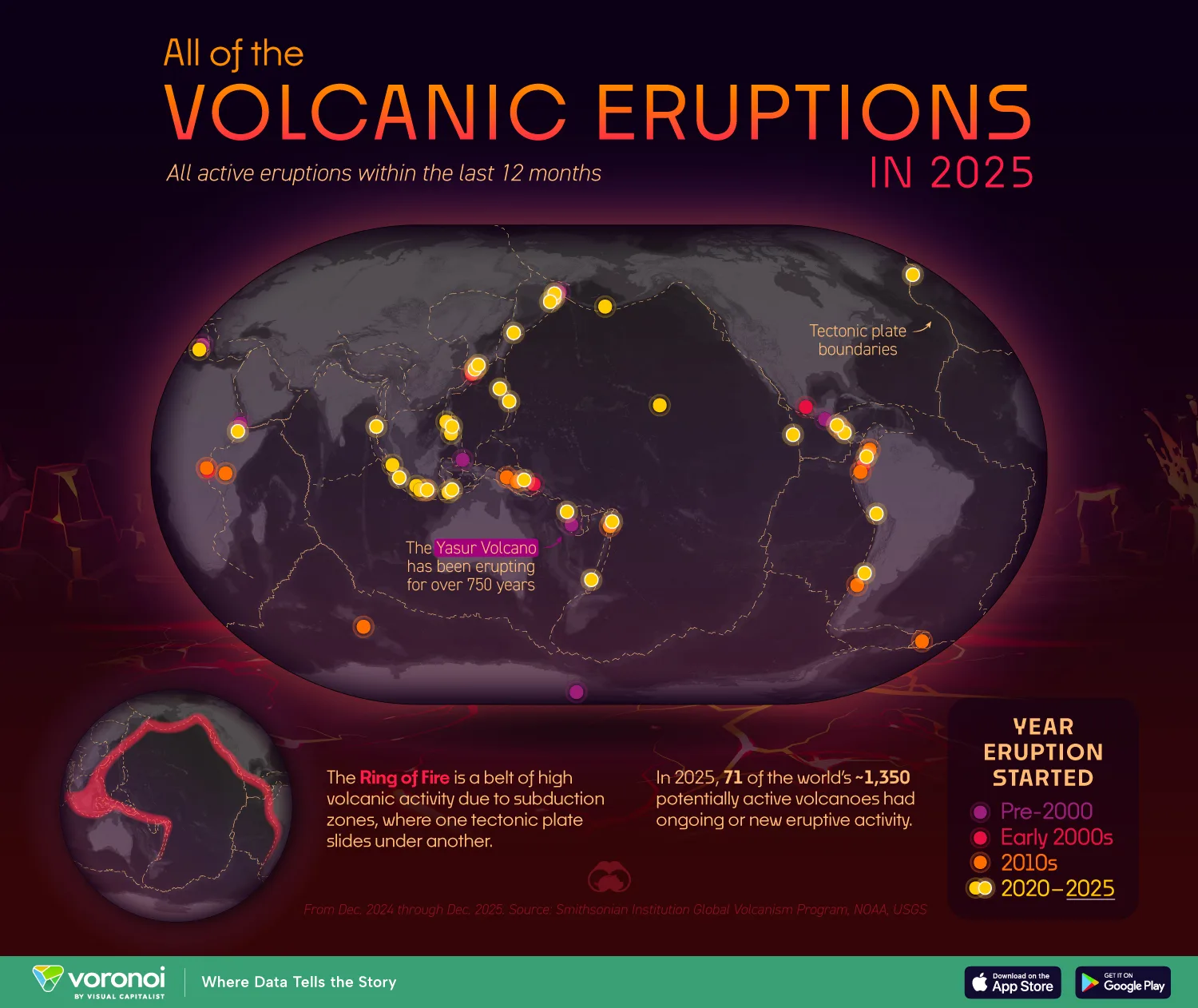 The data for this visualization comes from the Smithsonian Global Volcanism Program (GVP). It catalogs confirmed eruptive activity by volcano, location, eruption type, and duration, including eruptions that began before 2025 but remained active throughout the year.