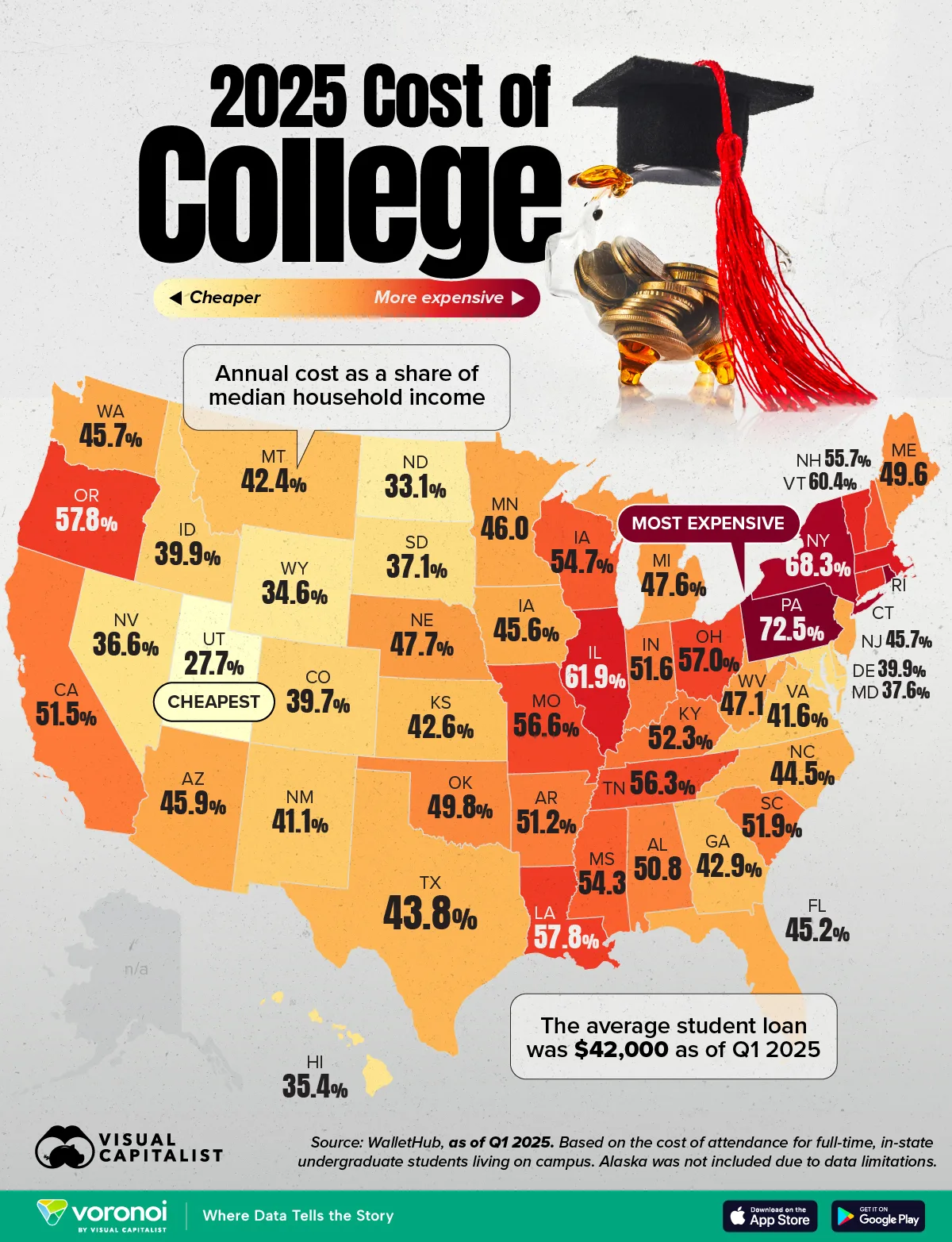 Pennsylvania ranks as the most expensive state for college, with costs reaching 72.5% of household income. This reflects high tuition levels even though the state invests heavily in financial aid.
