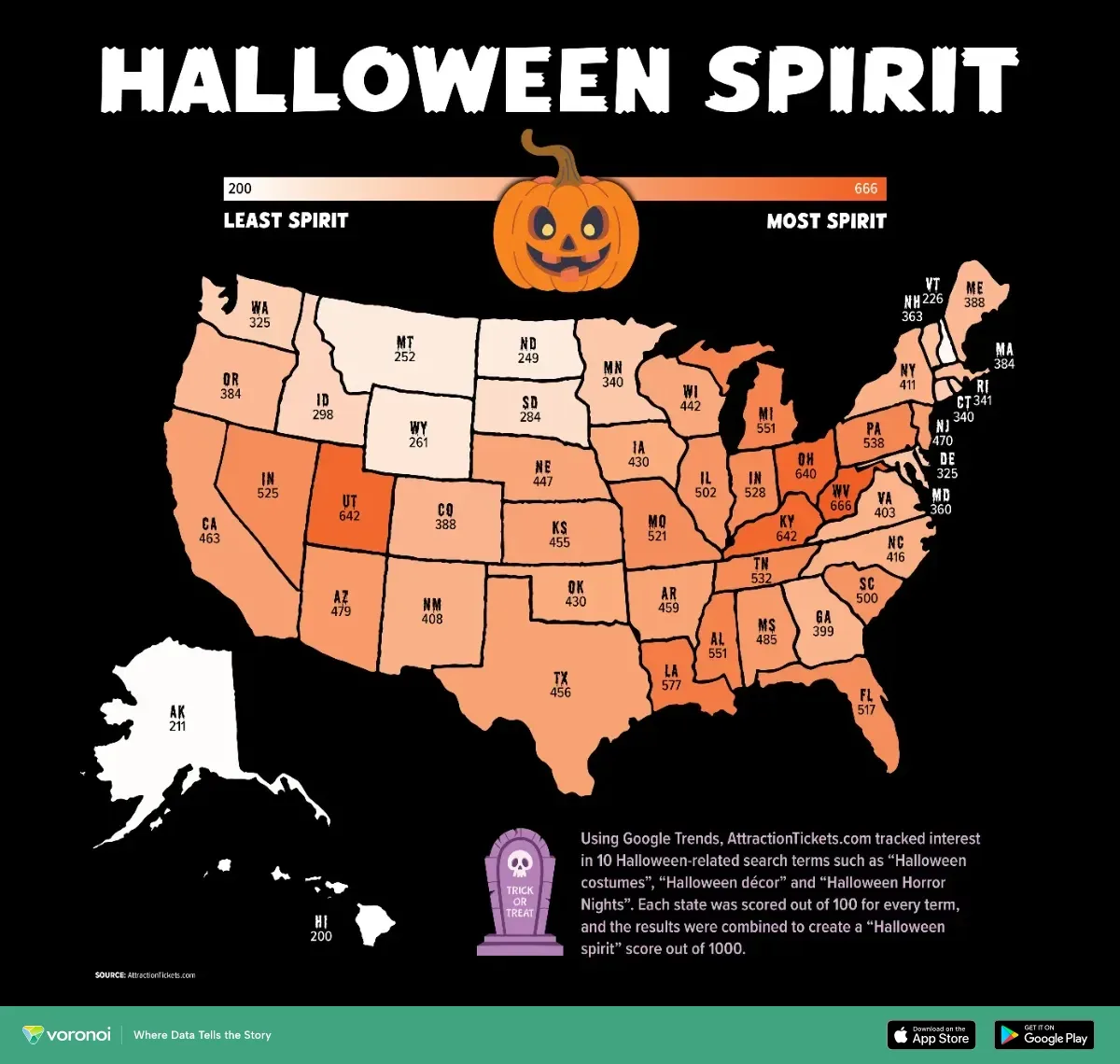 - West Virginia ranks #1 for Halloween spirit, scoring 666 out of 1000.