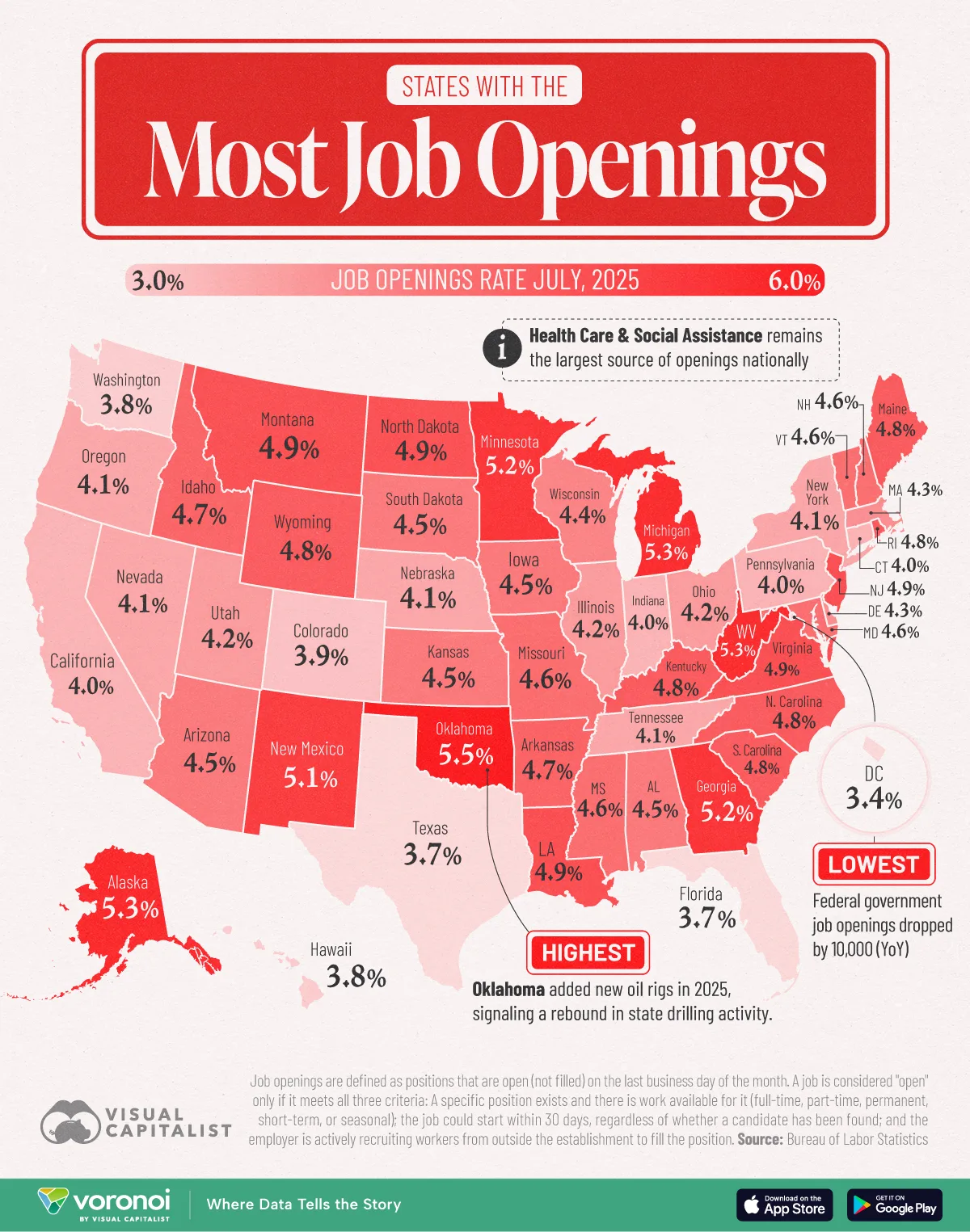 The chart below ranks states by their 2025 job-opening rates using data for this visualization comes from U.S. Bureau of Labor Statistics.