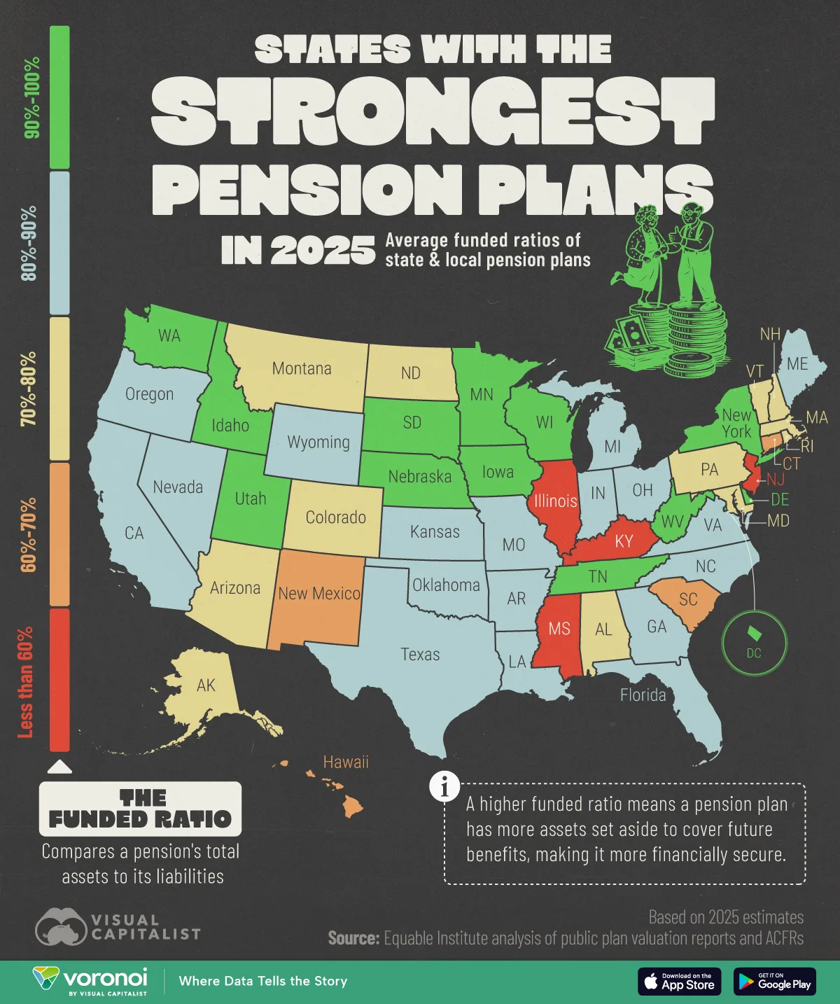 A funded ratio of 100% means a state can fully meet its future pension obligations, while lower ratios indicate potential fiscal challenges that may require increased contributions or benefit adjustments. Pensions with less than 60% funding are classified as “distressed”.