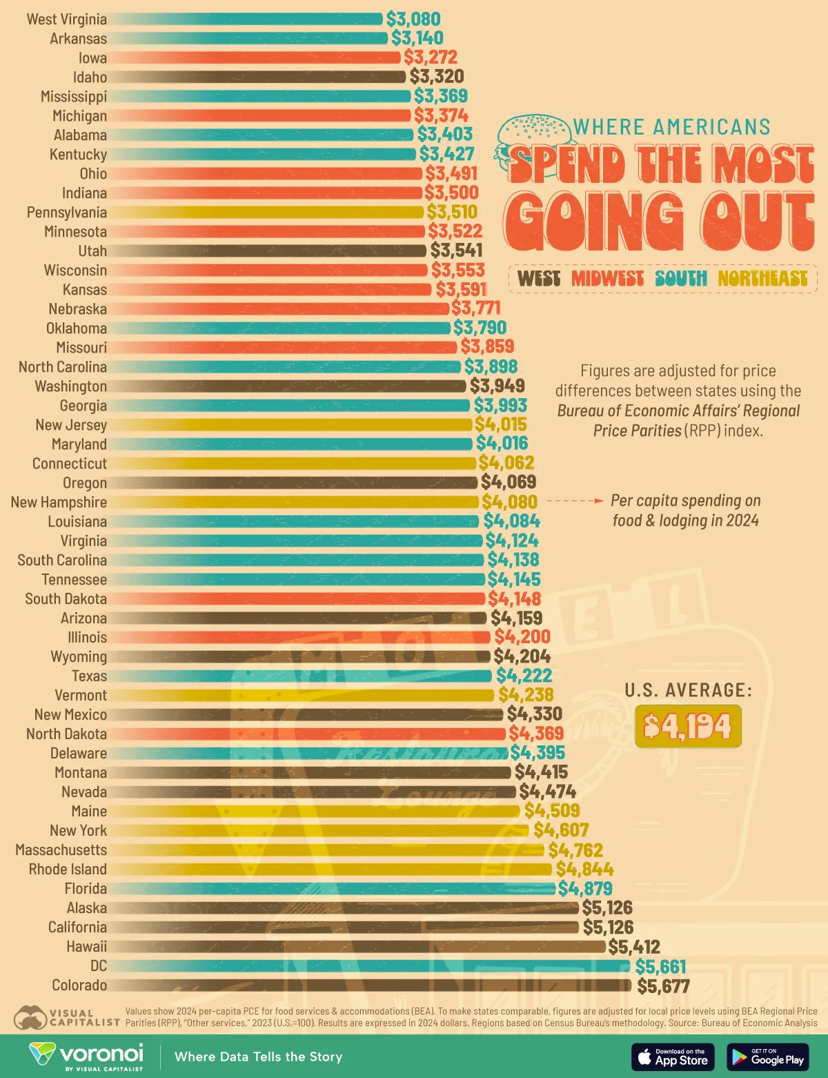 Right behind is the District of Columbia at $5,661, where a dense concentration of restaurants that caters to well-paid professionals.