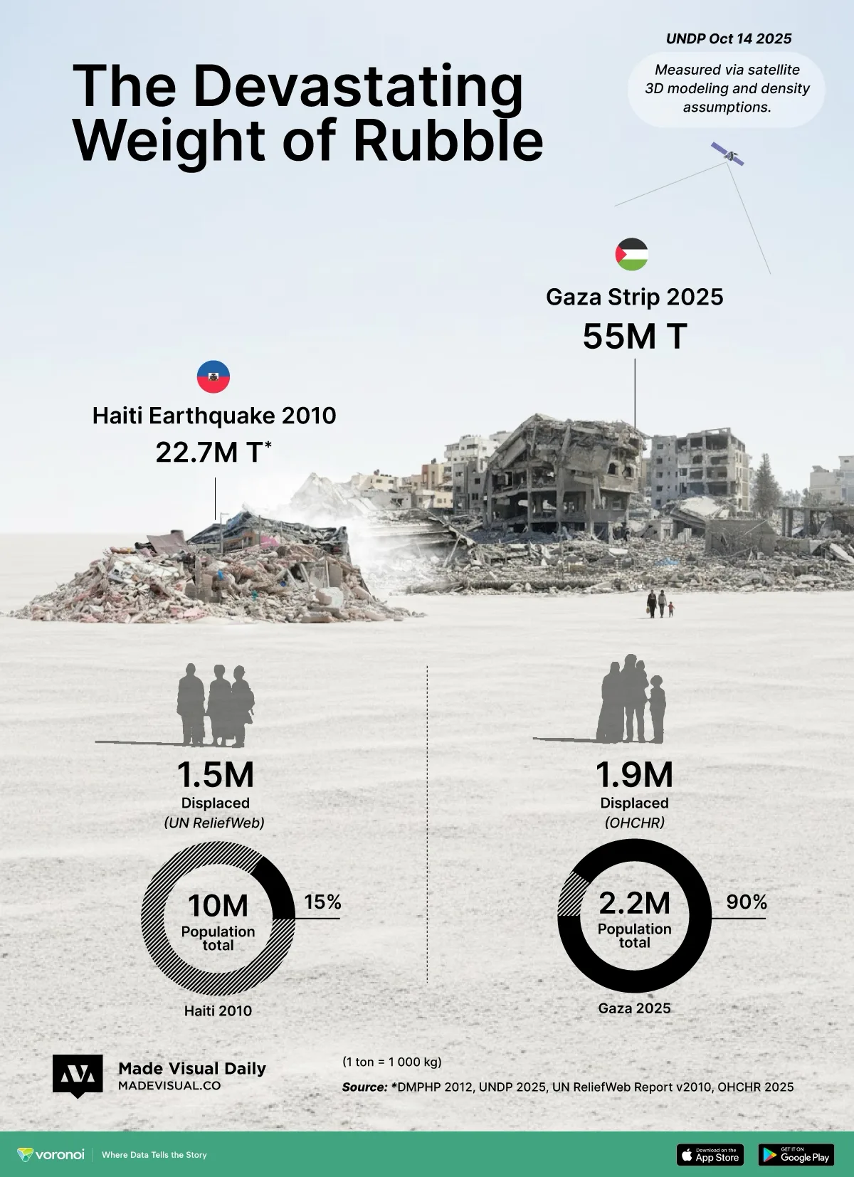 To put that in perspective, this is more than twice the debris generated by the catastrophic 2010 earthquake in Haiti, which produced around 23 million tonnes of rubble. The Gaza estimate was calculated using satellite-based 3D volumetric models combined with rubble density assumptions.